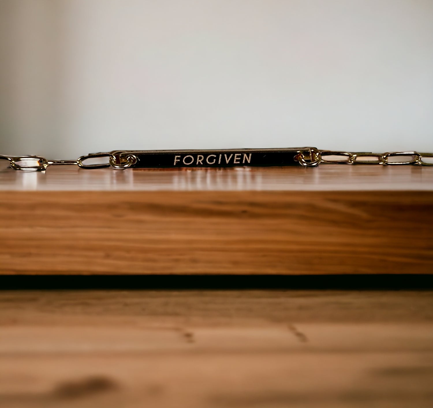 Elevate your style with our exquisite 14K gold-filled adjustable paper clip chain bracelet, delicately inscribed with the empowering word "FORGIVEN.” Finished with a dazzling AAA CZ dangling charm, adding a touch of sophistication to your ensemble. Embrace the dainty allure of this bracelet, designed to be the perfect accent piece for any occasion, effortlessly blending luxury with subtle charm.