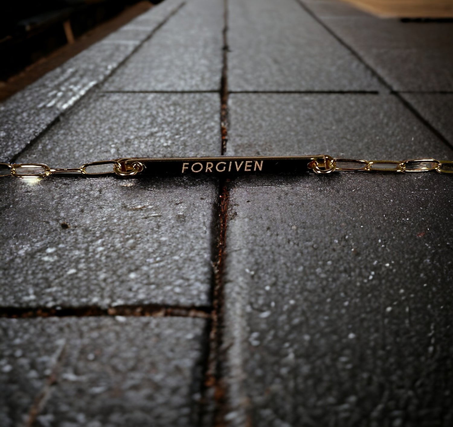 “FORGIVEN" Gold, Limited Edition, Solid Bar Engraved Bracelet with AAA CZ dangle charm