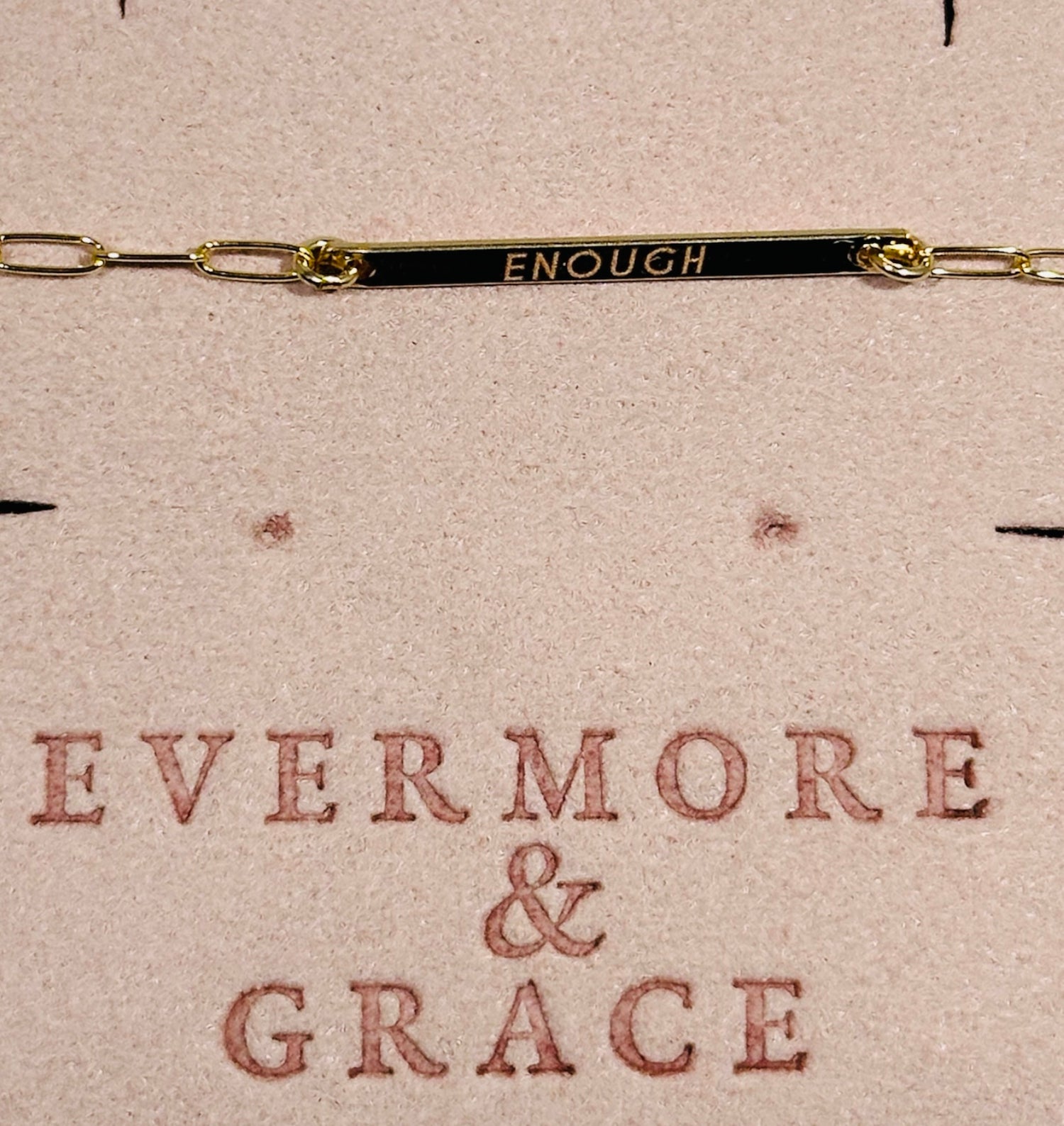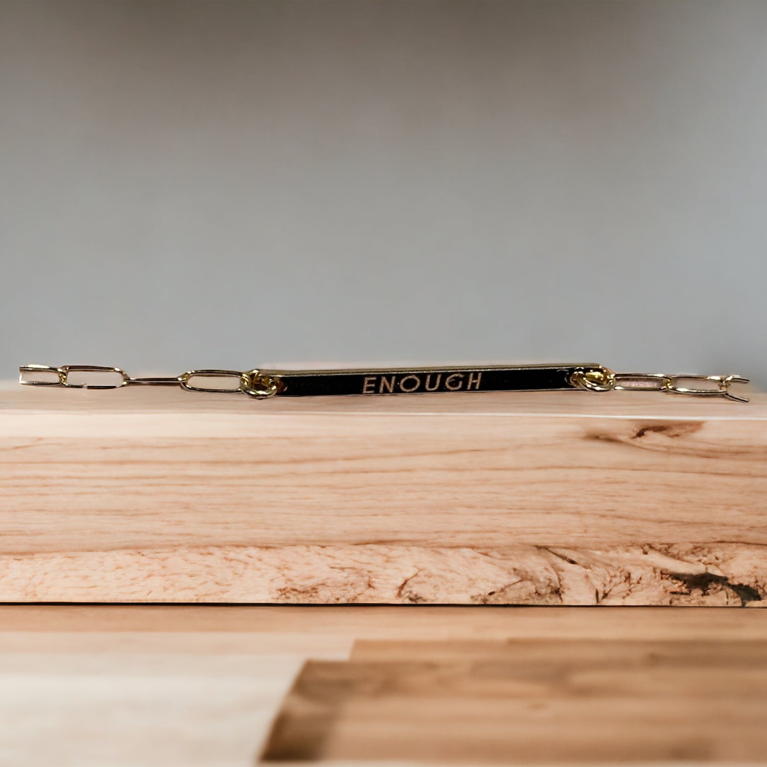 Elevate your style with our exquisite 14K gold-filled adjustable paper clip chain bracelet, delicately inscribed with the empowering word "ENOUGH.” Finished with a dazzling AAA CZ dangling charm, adding a touch of sophistication to your ensemble. Embrace the dainty allure of this bracelet, designed to be the perfect accent piece for any occasion, effortlessly blending luxury with subtle charm.
