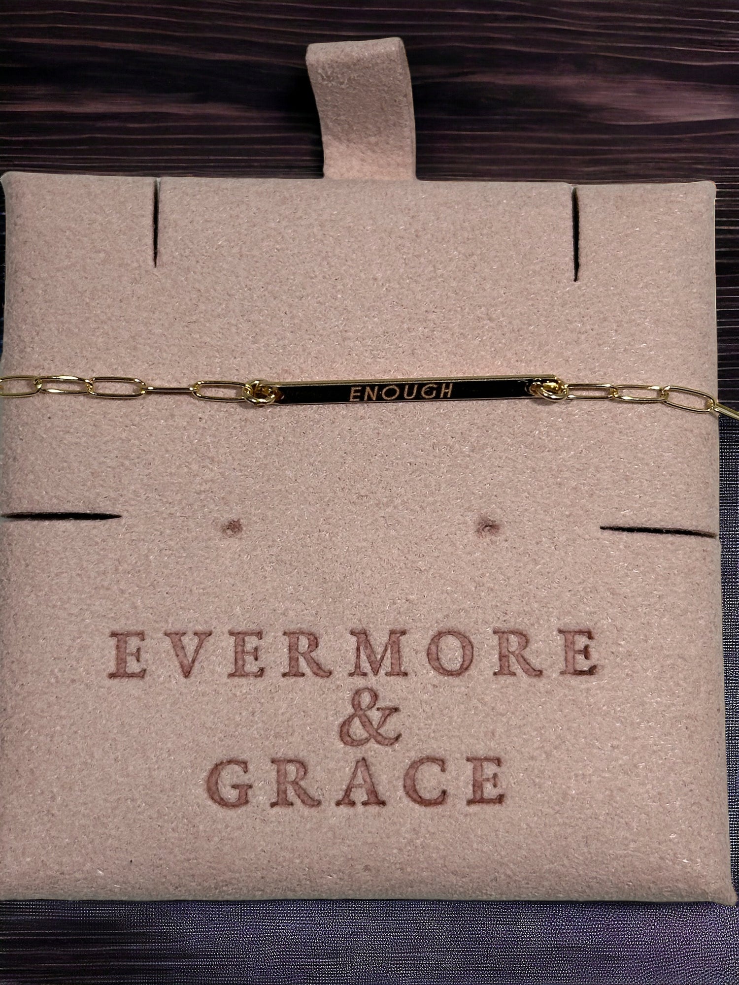 Elevate your style with our exquisite 14K gold-filled adjustable paper clip chain bracelet, delicately inscribed with the empowering word "ENOUGH.”This elegant piece is adorned with a dazzling AAA CZ dangling charm, adding a touch of sophistication to your ensemble. Embrace the dainty allure of this bracelet, designed to be the perfect accent piece for any occasion, effortlessly blending luxury with subtle charm.